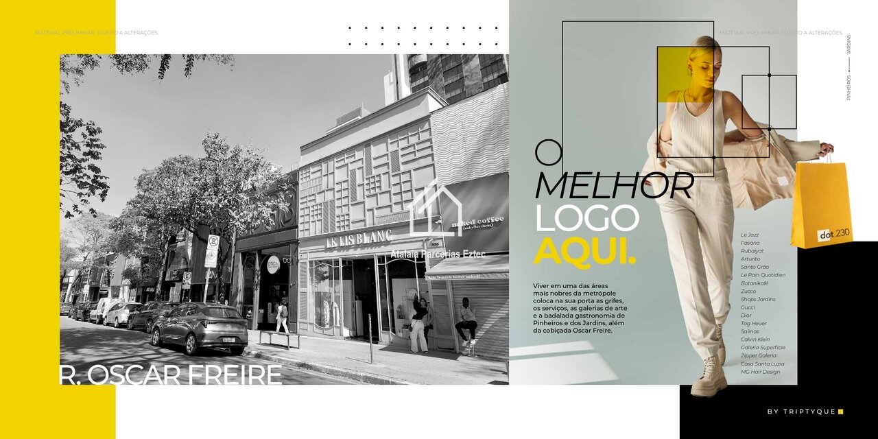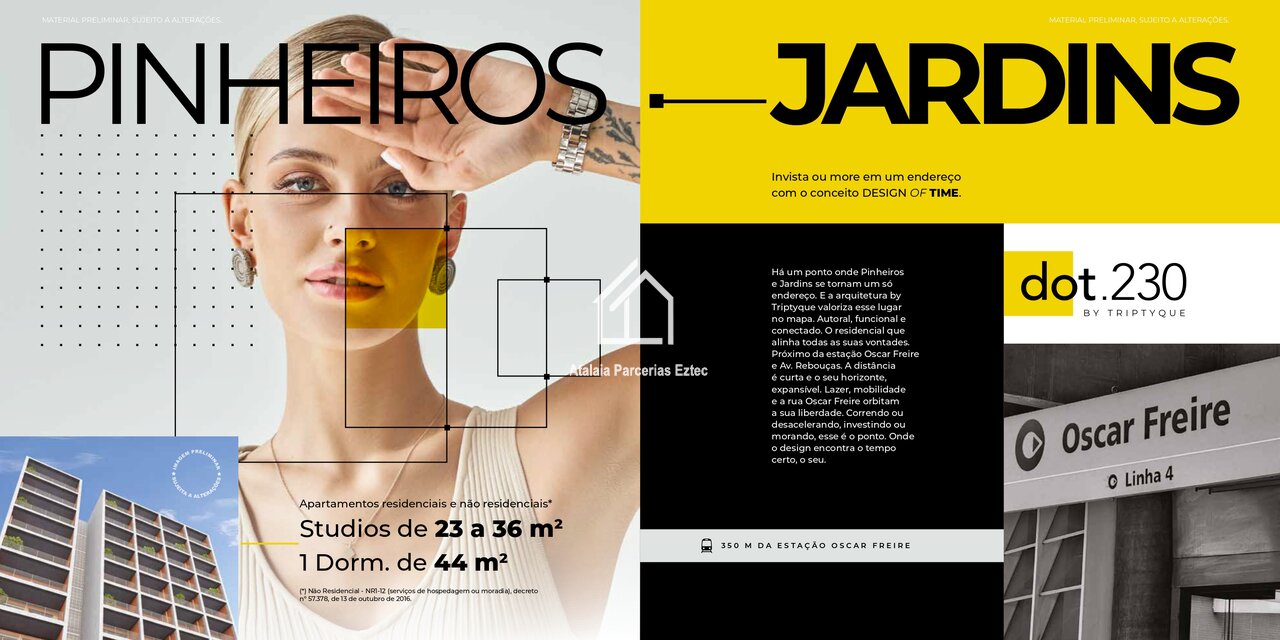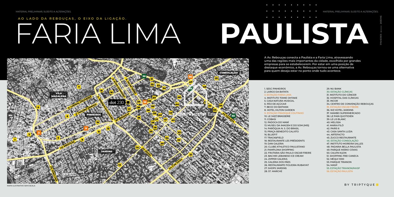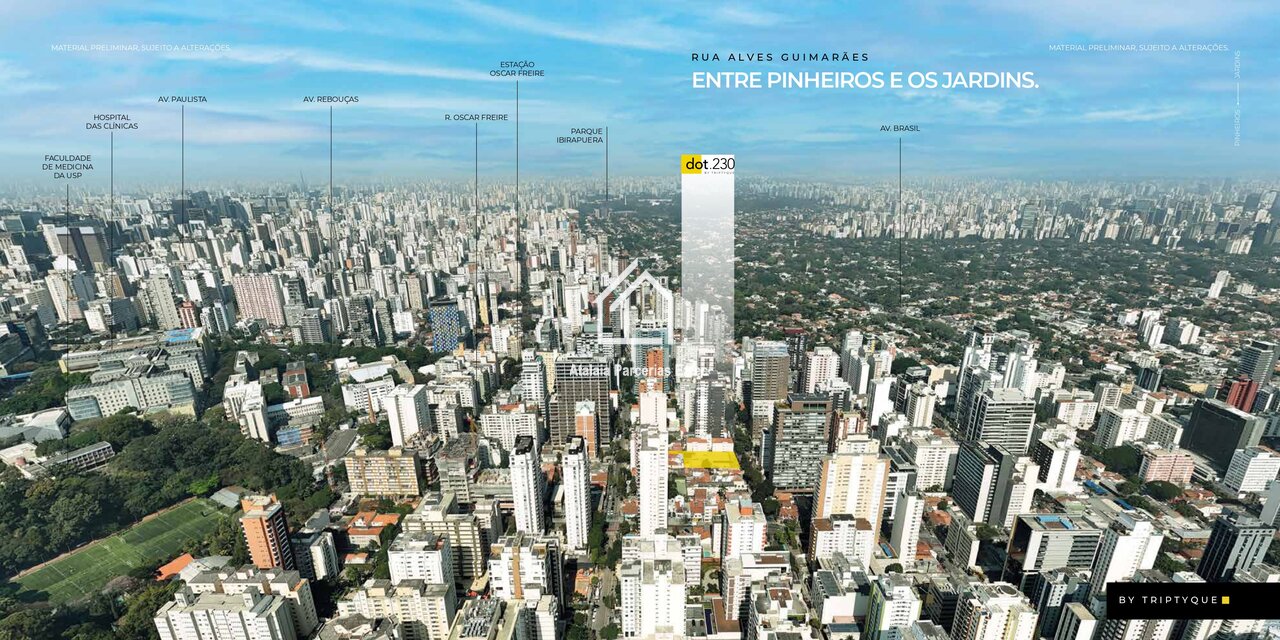 O DOT 230 é um empreendimento contemporâneo e urbano, localizado em um dos eixos mais valorizados da cidade, na Rua Alves Guimarães, 230, esquina com a Rua Capote Valente. O projeto foi pensado para atender tanto moradia quanto investimento, com forte apelo para locação de curta e longa duração.