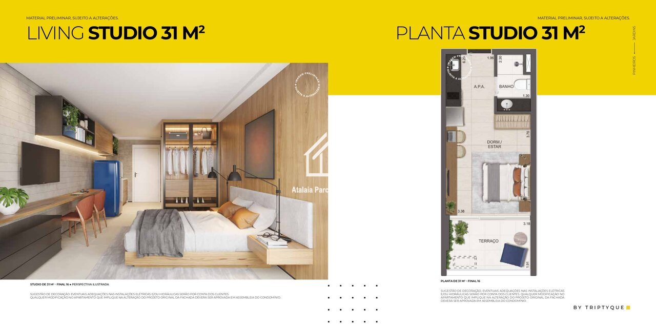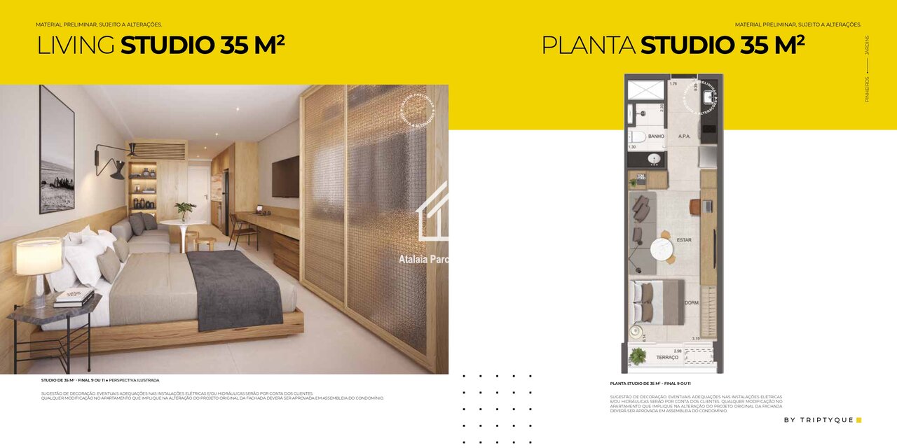 • Studios de 23 m², 32 m² e 35 m²