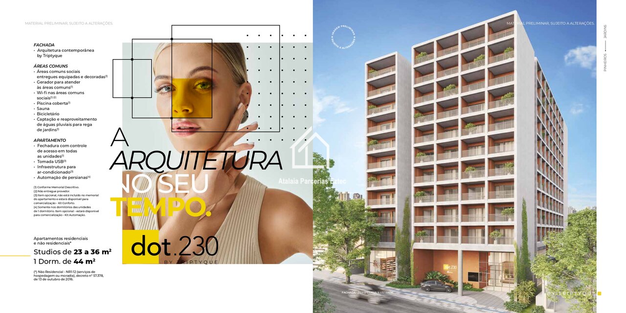 Com arquitetura assinada pelo renomado escritório Triptyque Architecture, o DOT 230 combina design autoral, funcionalidade e uma infraestrutura completa de lazer e serviços. O edifício possui unidades compactas e inteligentes, ideais para o estilo de vida moderno, além de áreas comuns que valorizam convivência, bem-estar e praticidade no dia a dia.