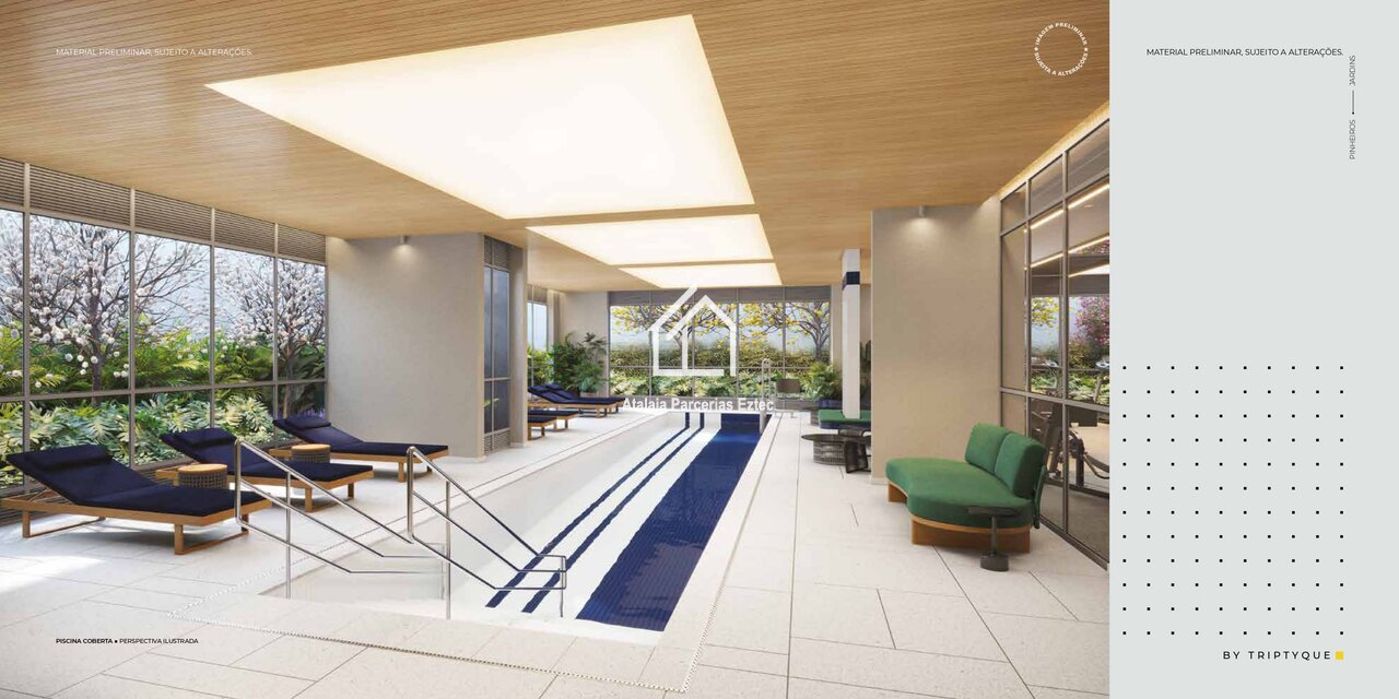 O empreendimento conta com lobby imponente com pé-direito duplo, coworking, mini market, espaço fitness completo, piscina coberta, salão de festas, espaço gourmet, lavanderia compartilhada e lojas no térreo, criando uma experiência urbana integrada e valorizada.